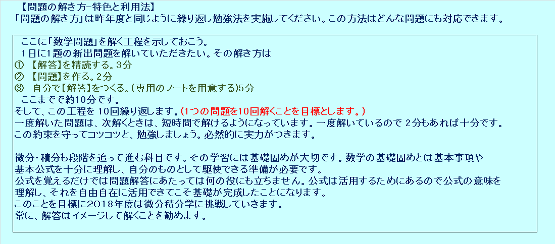数学の重要事項である「微分積分学」を愉しみながら、理解していきます。ここで鍛えられる思考力、記述力は大学入学後および卒業後の人生にも役立つと考えています。大いに利用してください。